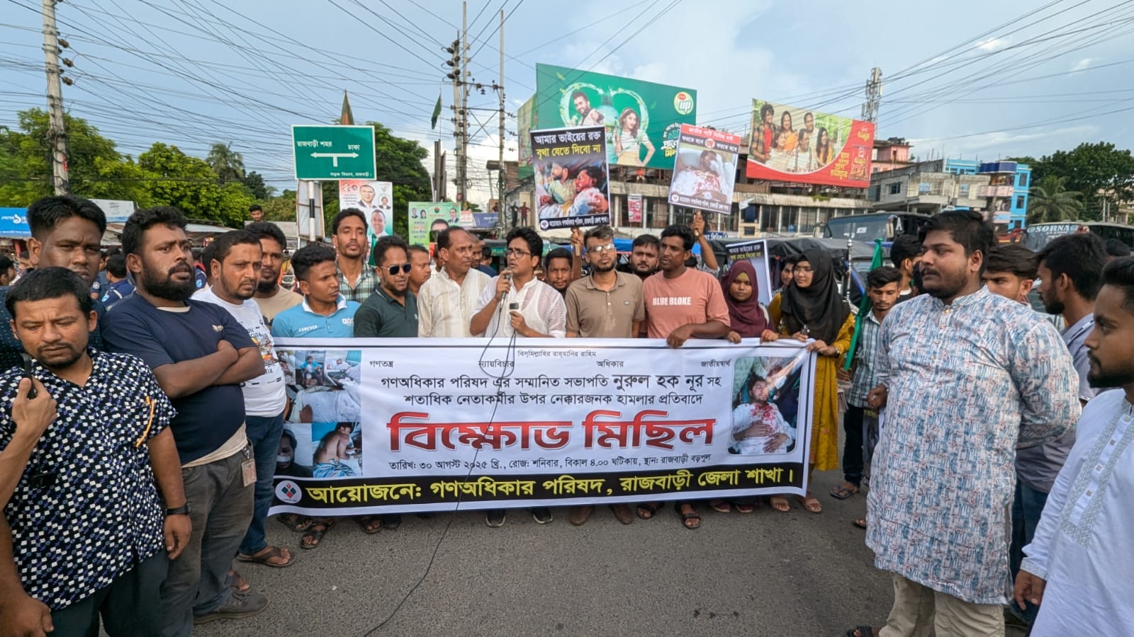 গণ অধিকার পরিষদের সভাপতি নুরুল হক নুরুর ওপর হামলার প্রতিবাদ জানিয়ে শনিবার সংগঠনের রাজবাড়ী সদর ও গোয়ালন্দ উপজেলা কমিটির আয়োজনে পৃথক স্থানে মহাসড়ক অবরোধ ও বিক্ষোভ মিছিল সহ প্রতিবাদ কর্মসূচি পালন করে।