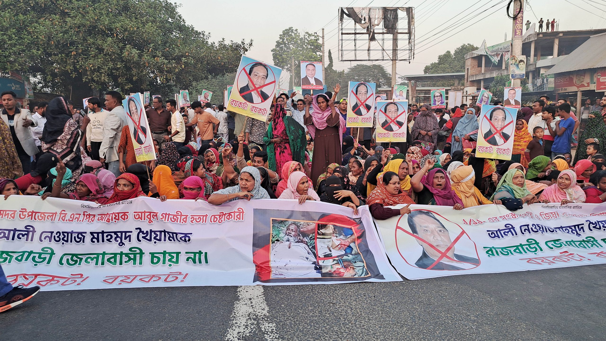 রাজবাড়ী-১ আসনে প্রার্থী পরিবর্তনের দাবিতে মহাসড়ক অবরোধ, কাফনের কাপড় পড়ে নেতাকর্মীদের বিক্ষোভ