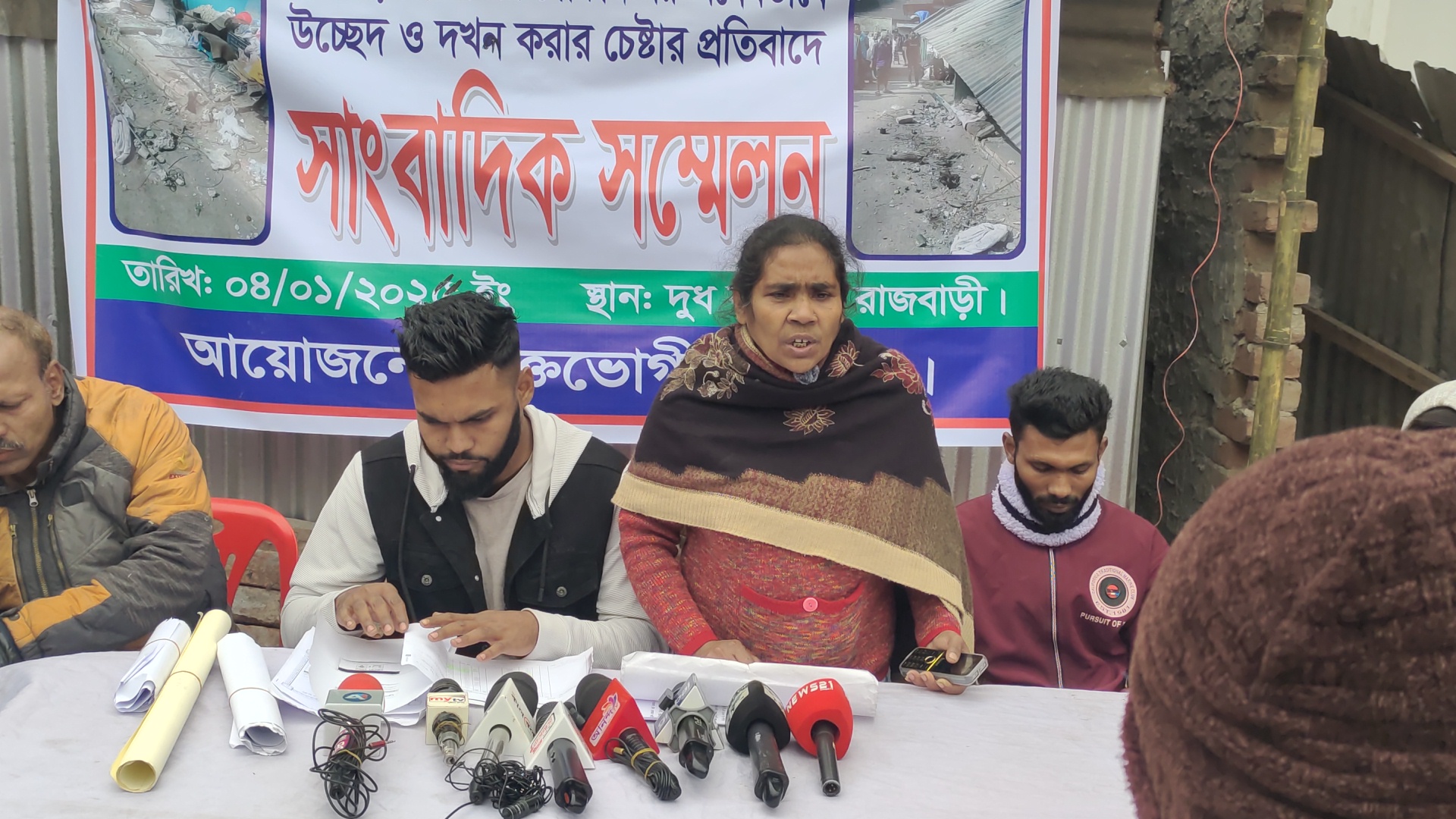 সংবাদ সম্মেলনে রোকেয়া বেগম অভিযোগ করে বলেন, দুধবাজার সংলগ্ন ৬২ লিংক খাস জমিতে প্রায় ৫৫ বছর ধরে তার শ্বশুর, স্বামী ও ছেলে সবজি ব্যবসা করে আসছেন। ওই এলাকায় বহু ব্যক্তি খাস জমি দখল করে ব্যবসা পরিচালনা করলেও শুধুমাত্র তাদের দোকানটিই উচ্ছেদ করা হয়েছে।