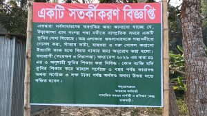 বৃহস্পতিবার (১৫ জানুয়ারি) সকালে সরেজমিন দেখা যায়, পদ্মা নদীর পাড়ে অবস্থিত ২৮ নং সরকারি প্রাথমিক বিদ্যালয়। নদীর সামনের দিকে বাঁশের সঙ্গে প্লাস্টিকের নেট দিয়ে ঘিরে রাখা হয়েছে। পাশে বড় করে সতর্কীকরণ সাইনবোর্ডে সাম্প্রতিক সময়ে পদ্মা নদীতে কুমির দেখার তথ্য জানানো হয়েছে। সবাইকে পদ্মা নদীতে গোসল করা, সাঁতার কাটা, মাছ ধরা এবং গরু গোসল করানোসহ আনুষাঙ্গিক কাজ থেকে বিরত থাকতে বলা হয়েছে। বন্যপ্রাণী (সংরক্ষণ ও নিরাপত্তা) অধ্যাদেশ ২০২৬ এর ধারা ৪১ এর ৩ অনুযায়ী কুমির দেখার পর শিকার নিষিদ্ধের কথা বলা হয়েছে। এ আইন কেউ অমান্য করলে তিন বছরের কারাদণ্ড অথবা সর্বোচ্চ তিন লাখ টাকা পর্যন্ত জরিমানা অথবা উভয় দন্ডে দন্ডিত হওয়ার কথা বলা হয়েছে।