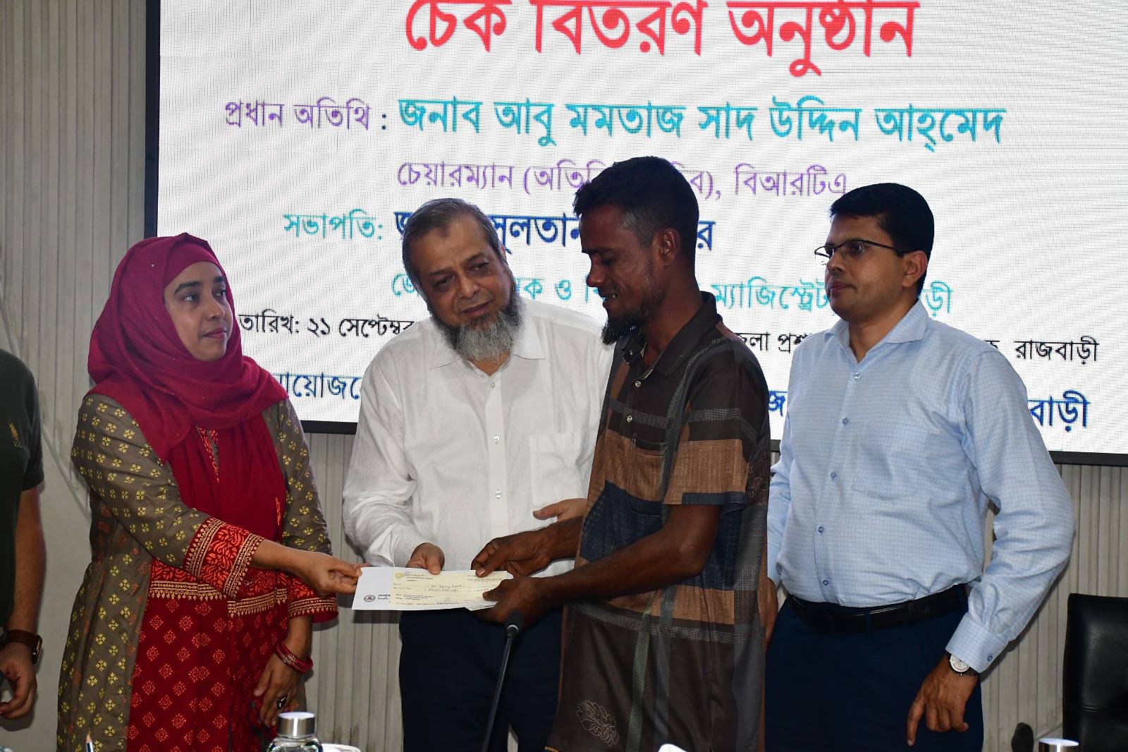 ইমরান হোসেন মনিম, রাজবাড়ীঃ রাজবাড়ী জেলায় সড়ক দুর্ঘটনায় আহত ও নিহত পরিবারবর্গের হাতে বিআরটিএ ট্রাস্টি বোর্ড থেকে মঞ্জুরিকৃত আর্থিক সহায়তার চেক বিতরণ করা হয়েছে। রোববার সন্ধ্যায় জেলা প্রশাসকের সম্মেলন কক্ষে জেলা প্রশাসন ও বিআরটিএ রাজবাড়ী সার্কেলের আয়োজনে চেক বিতরণ অনুষ্ঠানে প্রধান অতিথি ছিলেন বাংলাদেশ সড়ক পরিবহন কর্তৃপক্ষ (বিআরটিএ) চেয়ারম্যান (অতিরিক্ত সচিব) আবু মমতাজ সাদ উদ্দিন আহম্দে।