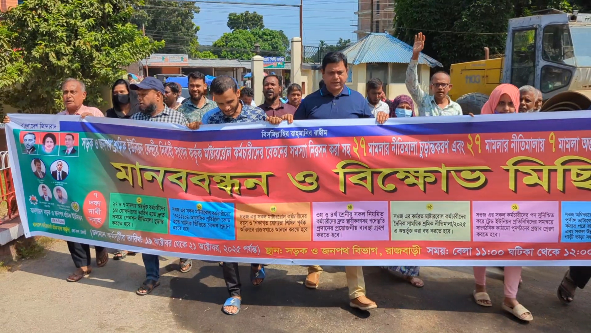তাঁরা আরও বলেন, “আমরা বছরের পর বছর রাস্তা সংস্কার, কালভার্ট নির্মাণ ও সরকারি প্রকল্পের কাজ করছি। অথচ এখনো স্থায়ী নিয়োগ দেওয়া হয়নি। পরিবার নিয়ে মানবেতর জীবনযাপন করছি। সরকারের প্রতি আহ্বান অবিলম্বে মাস্টাররোল কর্মচারীদের ন্যায্য দাবি মেনে নেওয়া হোক।” মানববন্ধন শেষে কর্মচারীরা বিক্ষোভ মিছিল বের করে রাজবাড়ী শহরের প্রধান সড়ক প্রদক্ষিণ করেন।