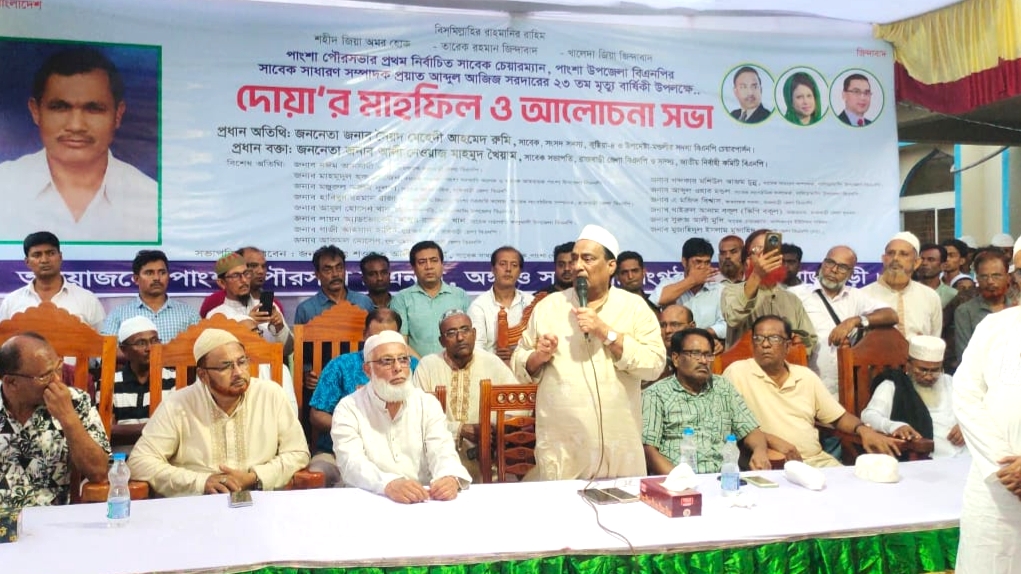 নিজস্ব প্রতিবেদক, পাংশা, রাজবাড়ীঃ রাজবাড়ীর পাংশা পৌরসভার প্রথম নির্বাচিত সাবেক চেয়ারম্যান ও পাংশা উপজেলা বিএনপির সাবেক সাধারণ সম্পাদক প্রয়াত আব্দুল আজিজ সরদারের ২৩ তম মৃত্যুবার্ষিকী উপলক্ষে দোয়া মাহফিল ও আলোচনা সভা অনুষ্ঠিত হয়েছে। শনিবার (২৫ অক্টোবর) বিকেলে আজিজ সরদার বাসস্ট্যান্ড এলাকায় পাংশা পৌর বিএনপি ও এর অঙ্গ ও সহযোগী সংগঠনগুলোর উদ্যোগে এই কর্মসূচি আয়োজন করা হয়।