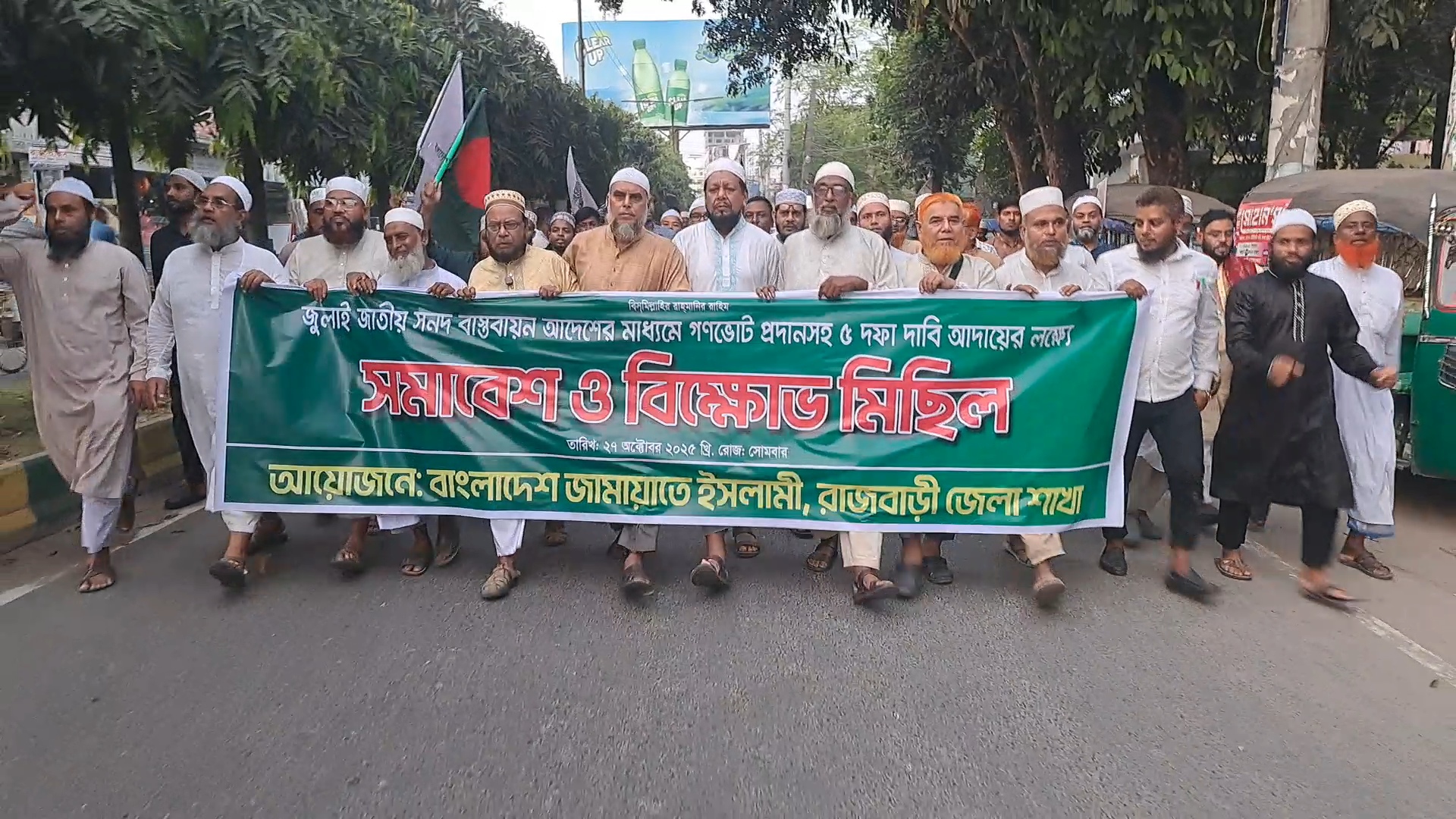 সমাবেশে আরও বক্তব্য রাখেন জামায়াতের রাজবাড়ী জেলা সেক্রেটারি আলীমুজ্জামান, রাজবাড়ী-২ আসনের মনোনীত প্রার্থী হারুন অর রশিদ, নায়েবে আমীর হাসমত আলী হাওলাদার, সদর উপজেলার আমীর মাওলানা সৈয়দ আহমেদ খান প্রমুখ। বিক্ষোভ ও সমাবেশে জেলা ও উপজেলা জামায়াতের বিভিন্ন স্তরের নেতাকর্মীরা অংশ নেন।