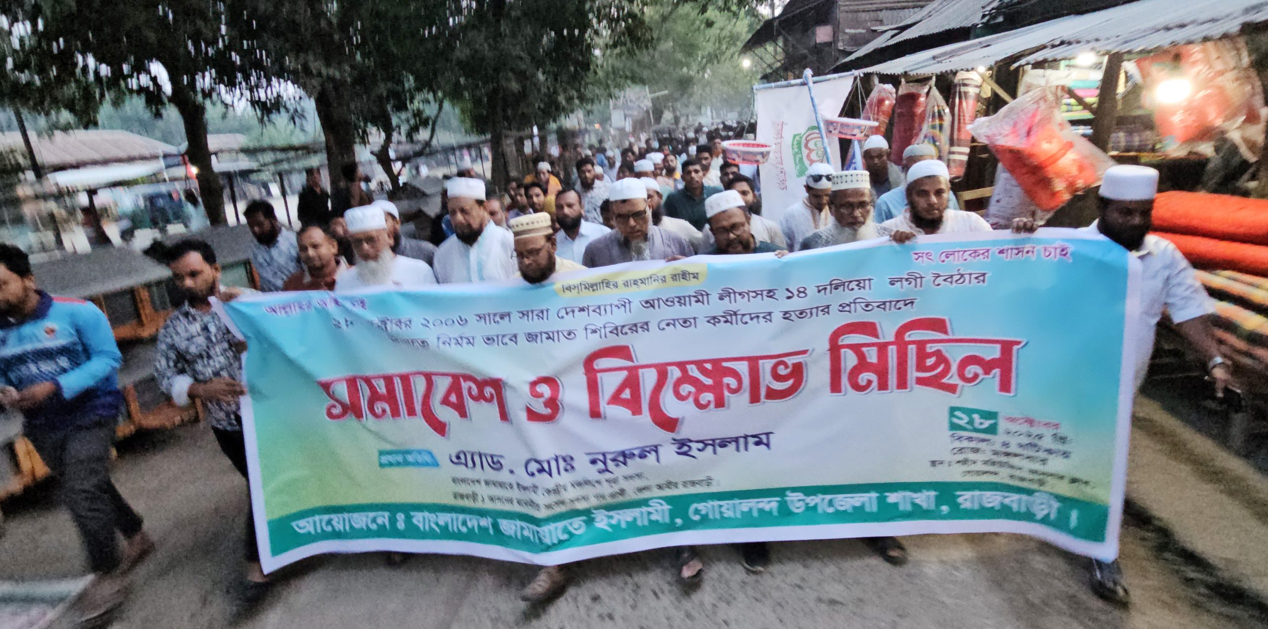 নিজস্ব প্রতিবেদক, গোয়ালন্দ, রাজবাড়ীঃ ২০০৬ সালের ২৮ অক্টোবর সারা দেশব্যাপী আওয়ামী লীগ সহ ১৪ দলীয় লগি বৈঠার আঘাতে নির্মমভাবে জামায়াত শিবিরের নেতা কর্মীদের হত্যার প্রতিবাদে রাজবাড়ীর গোয়ালন্দে সমাবেশ ও বিক্ষোভ মিছিল অনুষ্ঠিত হয়েছে।